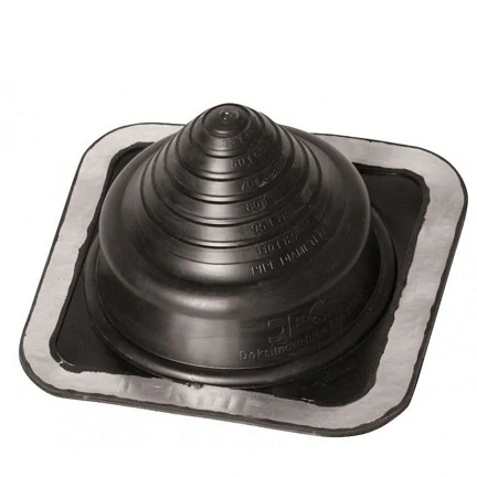 Manžeta DEKTITE® typ Square je nejpoužívanějším řešením těsnění prostupů trapézovými nebo vlnitými plechovými krytinami, případně vlnitými krytinami z cementovláknitých materiálů s výškou max. 45mm. Je určena pro sklon střechy od 0° do 35° (pro typ DFE 0-35 od 0° do 60°).