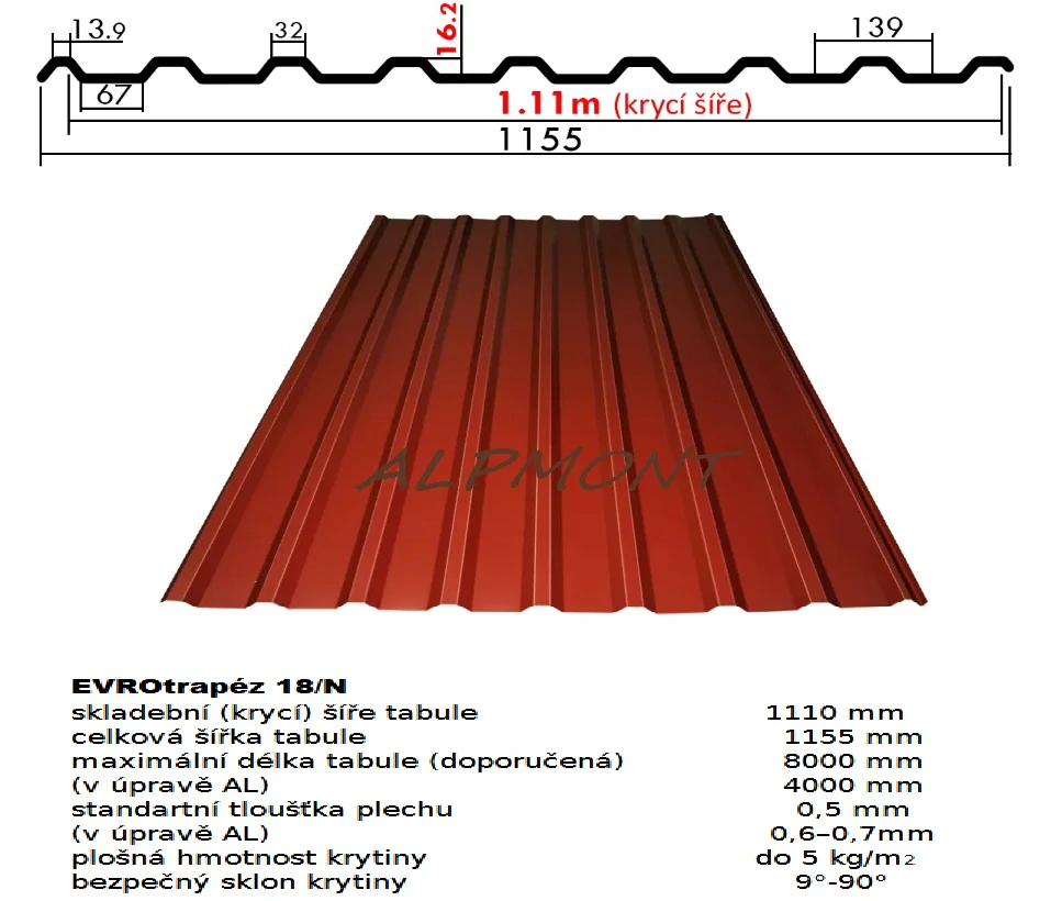 Trapézový plech 18/N lakovaný pozink 0.5mm RAL 3009 červená oxid dl.3,5mb