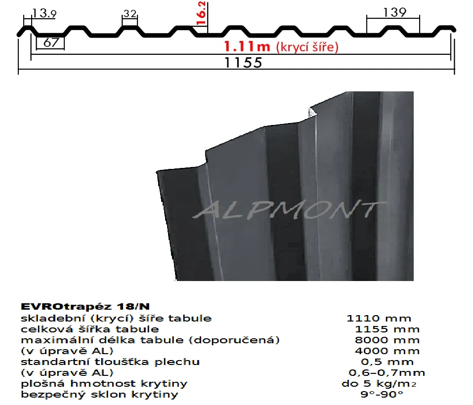 - Trapézový plech 18/N lakovaný pozink 0.5mm RAL 7016 antracit dl.8mb