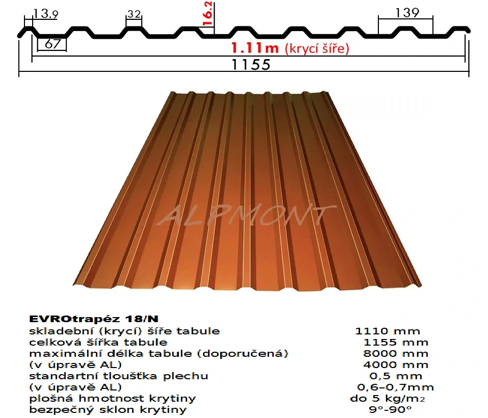 Trapézový plech 18/N lakovaný pozink 0.5mm RAL 8004 cihlová dl.7mbdo 7 dnů2 170,00 Kč/ ks1 793,39 Kč bez DPH