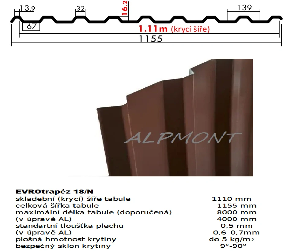 Trapézový plech 18/N lakovaný pozink 0.5mm RAL 8017 hnědá čoko dl.5,5mb