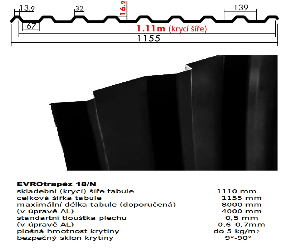 Trapézový plech 18/N lakovaný pozink 0.5mm RAL 9005 černá dl.2,5m