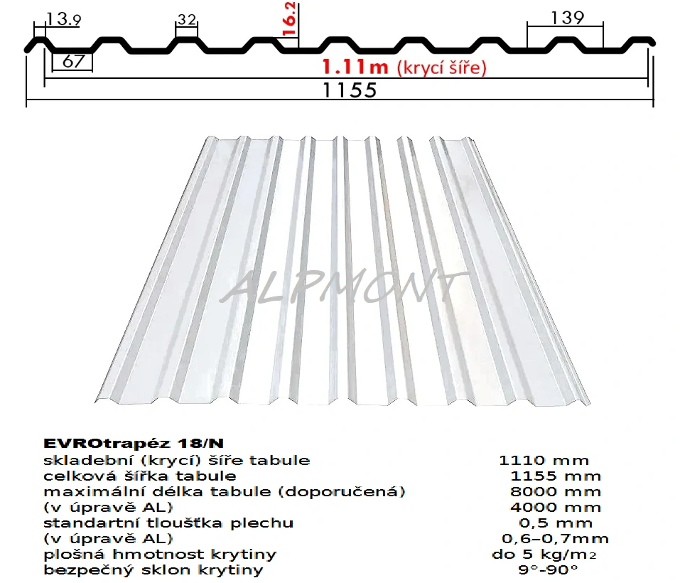 Trapézový plech 18/N lakovaný pozink 0.5mm RAL 9007 stříbrná tmavá dl.7mbdo 7 dnů2 170,00 Kč/ ks1 793,39 Kč bez DPH