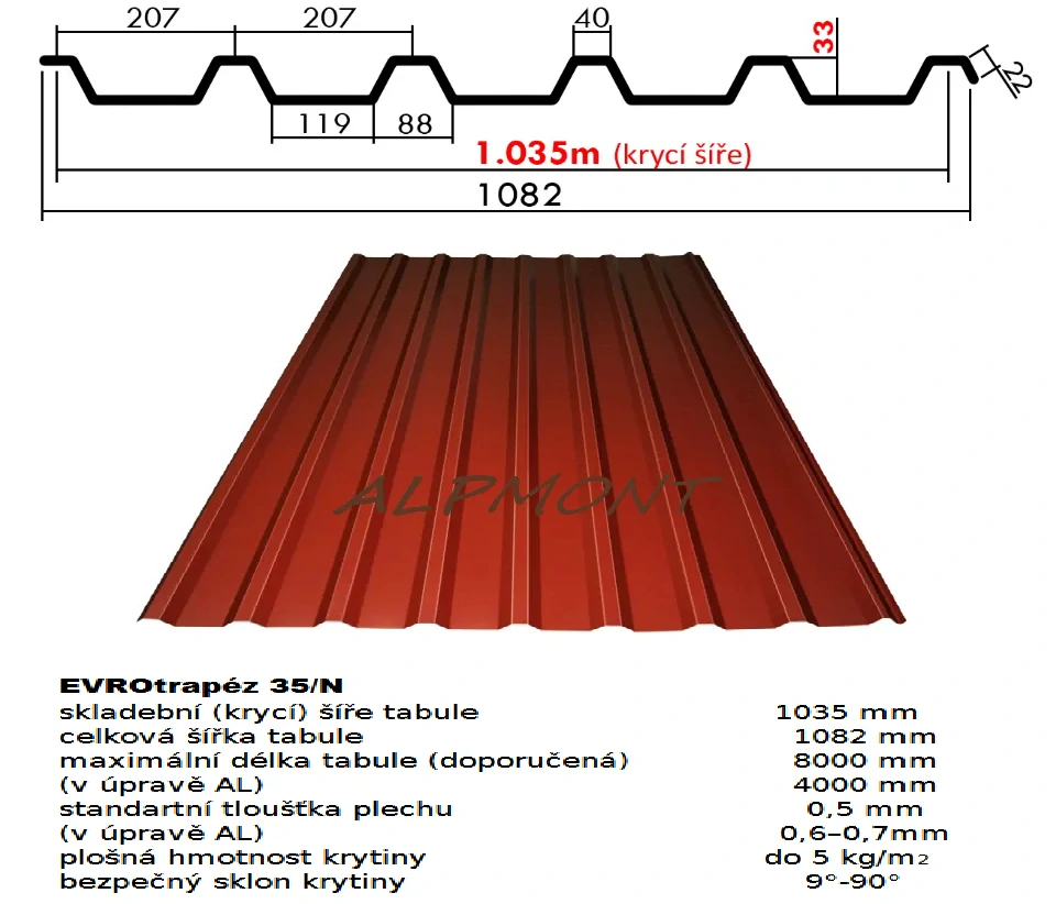 Trapézový plech 35/N lakovaný pozink 0.5mm RAL 3009 červená oxid dl.3mb
