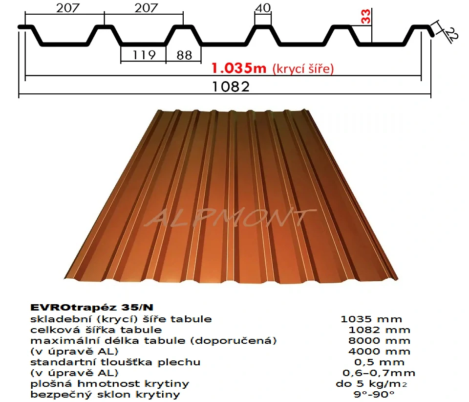 Trapézový plech 35/N lakovaný pozink 0.5mm RAL 8004 cihlová dl.6mb