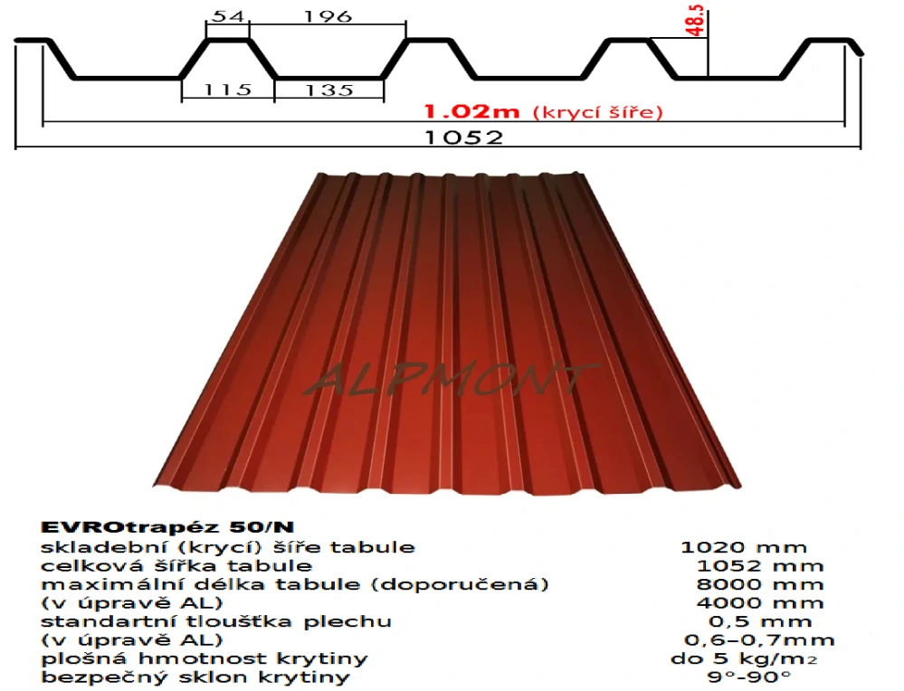 Trapézový plech 50/N lakovaný pozink 0.5mm RAL 3009 červená oxid dl.8mb