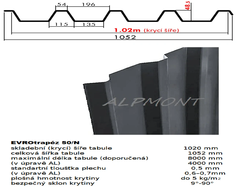 - Trapézový plech 50/N lakovaný pozink 0.5mm RAL 7016 antracit dl.8mb