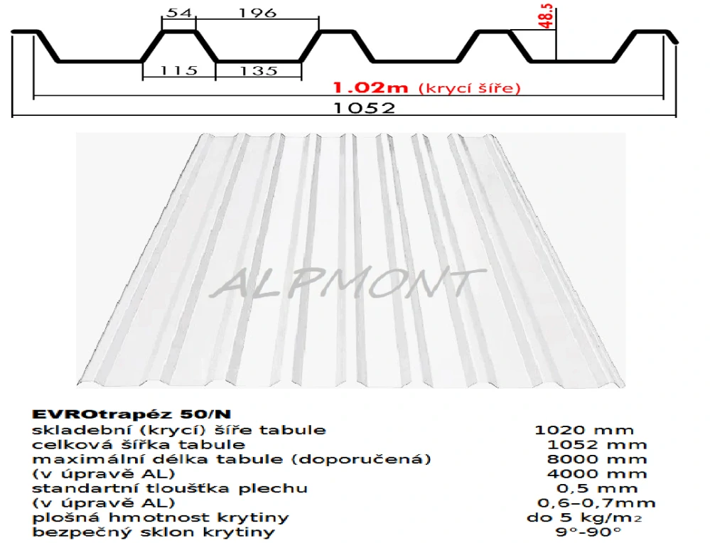 - Trapézový plech 50/N lakovaný pozink 0.5mm RAL 9010 bílá dl.5mb