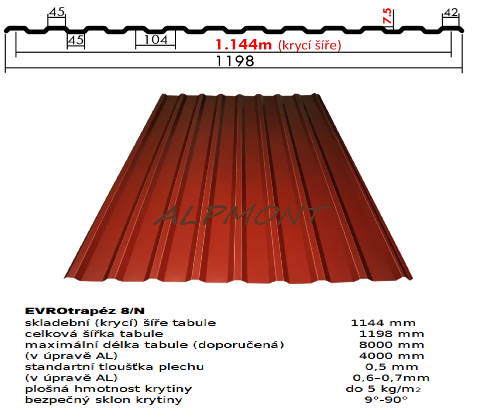 Trapézový plech 8/N lakovaný pozink 0.5mm RAL 3009 červená oxid dl.3,5mb
