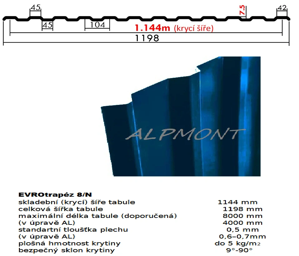 Trapézový plech 8/N lakovaný pozink 0.5mm RAL 5010 enziánová modrá dl.7mbdo 7 dnů2 205,00 Kč/ ks1 822,31 Kč bez DPH