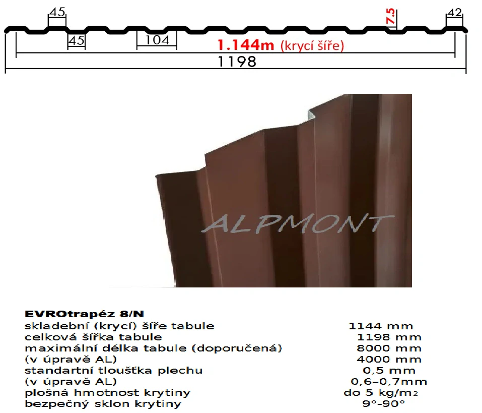 Trapézový plech 8/N lakovaný pozink 0.5mm RAL 8017 hnědá čoko dl.4mb